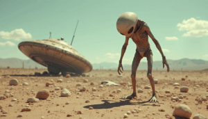 A retro sci-fi daydream brought to life with AI animation.A relaxed alien lounges on warm desert sand while a dusty…