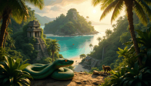 An AI-animated postcard from a hidden tropical lagoon: emerald water, vine-covered stone temples, a thin waterfall, and an alert green…