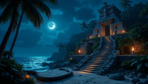 A nocturnal vignette on a tropical shore: moonlight silvers the waves while torchlit steps lead to an ancient seaside temple….