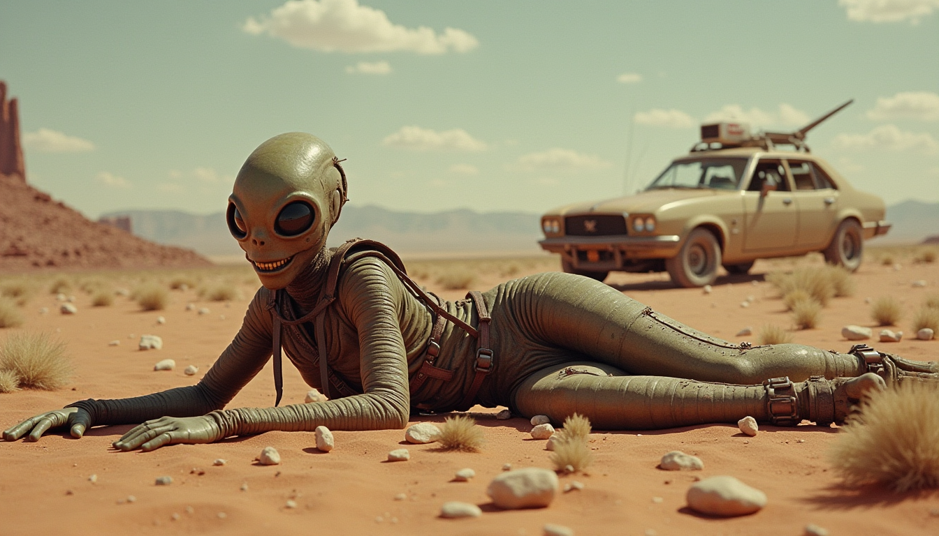 A relaxed alien lounges on warm desert sand while a dusty 70s sedan idles in the background. Subtle motion breathes through the frame: heat-haze over the dunes, drifting dust, a gentle camera sway, soft suit creases settling, a blink and faint smile, distant mirage shimmer around the car and antenna. Graded with vintage tones and light film grain for a true VHS-era feel, set to a synth-ambient bed.
